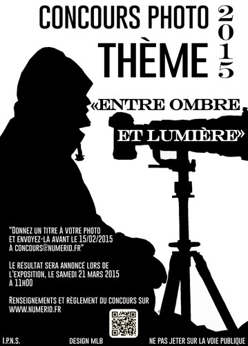Règlement du concours 2015: Le concours organisé par Numér’ID est ouvert à tous, la participation est gratuite. Le thème pour 2015 est : "Entre ombre et lumière". Pour participer, vous devez envoyer une photo à concours@numerid.fr Il ne sera accepté qu’une seule photo par personne. Vous devez être l’auteur de la photo et posséder les droits de toutes personnes, monuments ou objets identifiables sur la photo. Des lots offerts par nos partenaires seront donnés aux 5 gagnants. Les lots "physiques" (matériel photo) seront remis en mains propres ou à une personne désignée par le gagnant, les lots "non physiques" (codes de réduction) seront envoyés par mail. Chaque gagnant se verra offrir sa photo au format 20x30 encadré par Jouanneau Boutique à Commentry. Votre mail pourra être communiqué à nos partenaires sauf si vous vous y opposer en le précisant lors de l'envoi de votre photo par mail. Les photos participantes seront affichées pendant l’exposition du mois de mars 2015, mais ne seront jamais utilisées à d’autres fins. Merci de fournir une photo de résolution suffisante pour une impression en 20x30cm. | ||||||||||||||||||||||||||||||||