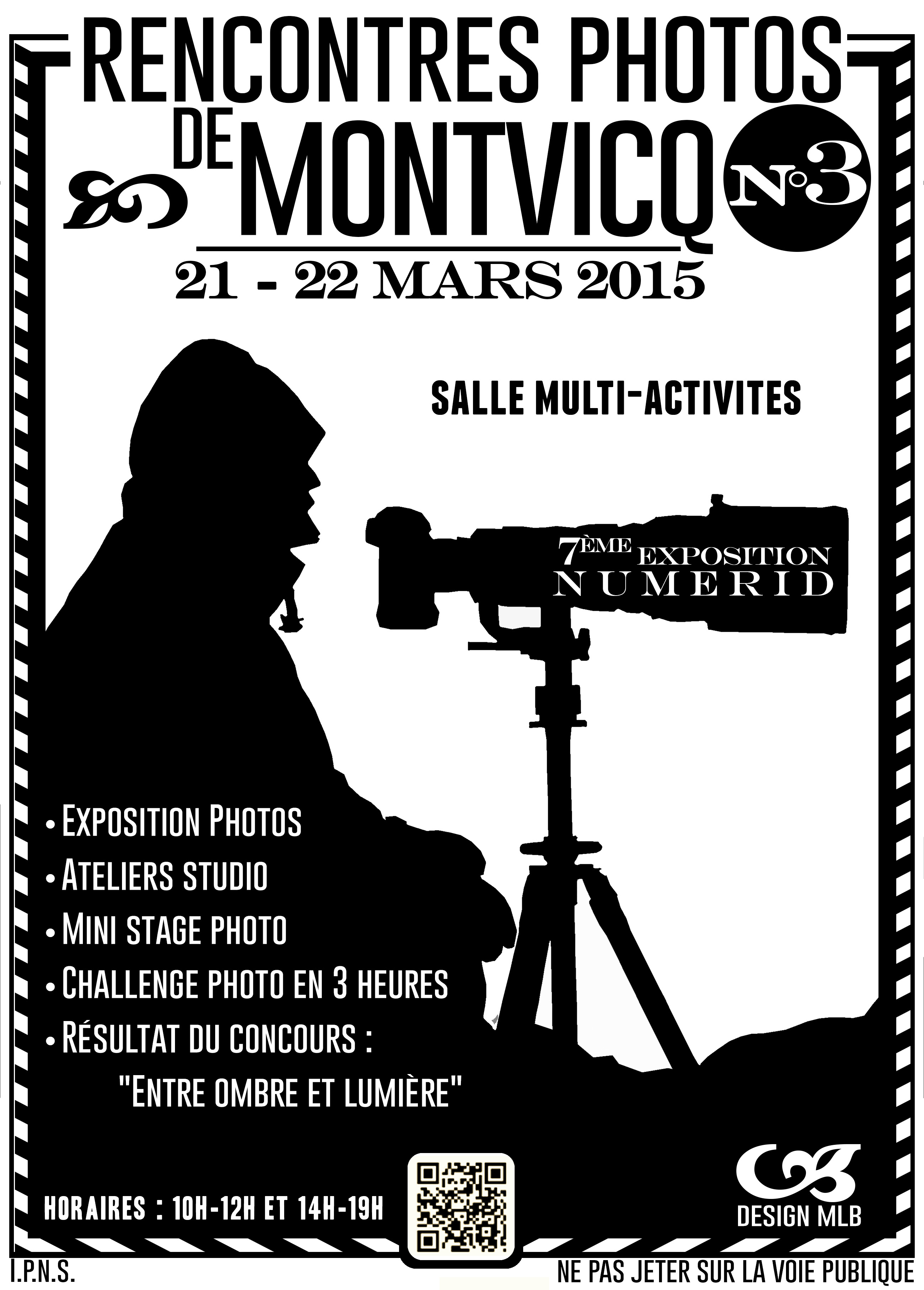 Samedi 21 mars : Préparer vos appareils : Vous aurez un thème qui vous sera donné, vous aurez 3 heures pour faire une photo respectant ce thème...car à 17h00 les photos des participants seront jugées, et un seul sera le gagnant ! (des ordinateurs seront disponibles sur place pour sortir les fichiers des cartes mémoires) Le classement des photos se fera sur 4 critères : Respect du thème, Originalité, Esthétique, Technique. Chaque critère sera noté de 0 à 5 points. Dimanche 22 mars : Sur tout le week-end : L'originalité de cette année vient de notre partenaire Solemur ... petit indice...  ...!!! Concours terminé !! Merci aux 143 participants. Merci au mensuel "Reflet d'Allier" pour ce superbe article concernant le concours et l'exposition ! Site Reflet d'Allier ou directement sur la bonne page en cliquant ICI !   Cliquez ICI pour prendre connaissance du règlement Pour nous suivre sur FaceBook : Page FaceBook :   Rencontres Photo 2015 Les 21 et 22 mars 2015, Numér'ID organise les "Rencontres Photo de Montvicq N°3" Ce sera aussi la 7ème exposition ! et pour midi, n'oubliez pas que la Tour 2 Pizz' sera sur la place de l'église pour vous proposer pizzas et paninis   Archives 2014 Venez régulièrement prendre des nouvelles sur ce site... Pour nous contacter : contact@numerid.fr Pour venir à l'expo à l'aide de Google Maps : Cliquez ICI pour voir la carte Nos principaux partenaires de l'exposition :